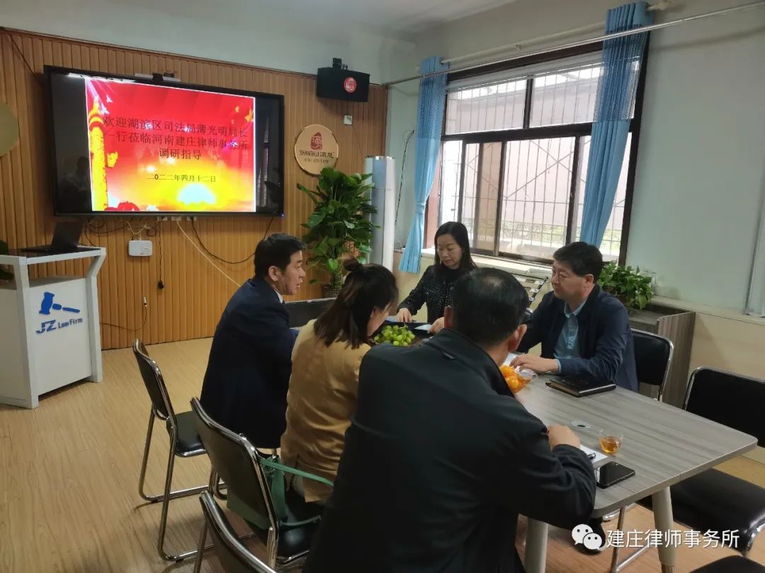 4月12日下午,湖滨区司法局党组书记、局长薄光明一行到河南建庄律师事务所调研指导。采取听、看、查、问等方式,查看了村(居)法律顾问服务日志、千所联千企,法律服务总结等台账,听取律师事务所主任刘建庄的汇报工作,详细了解了律所管理、队伍建设等相关情况,对如何在新形势下律师事务所的发展理念、管理模式、业务拓展、团队精神、品牌文化等方面进行了深入探讨。